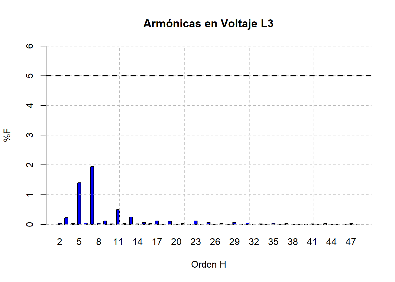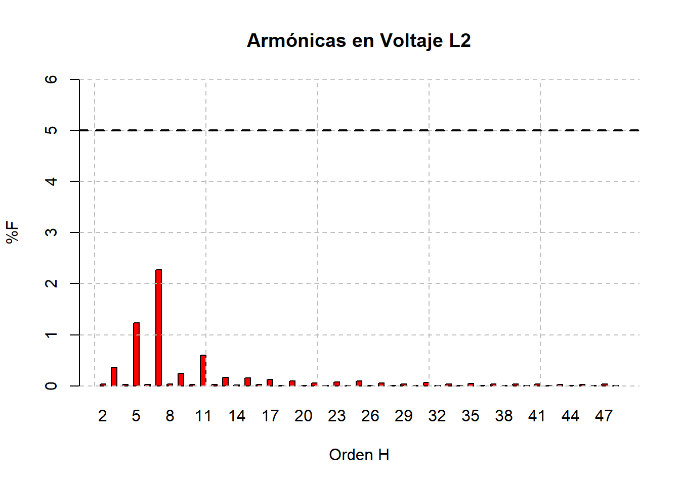 La DATD medida fue de 8.02% siendo el límite de 8%. Y la armónica 5ª tiene un valor de 7.13% siendo el límite de 7%. Prácticamente se puede decir que están el en límite, pero esta condición ha permanecido en los últimos tres meses. Reduciendo la 5ª armónica se puede cumplir con ambos índices, se recomienda revisar en los transformadores cuál de ellos tiene la mayor aportación de la 5ª armónica y tratar de reducirla.